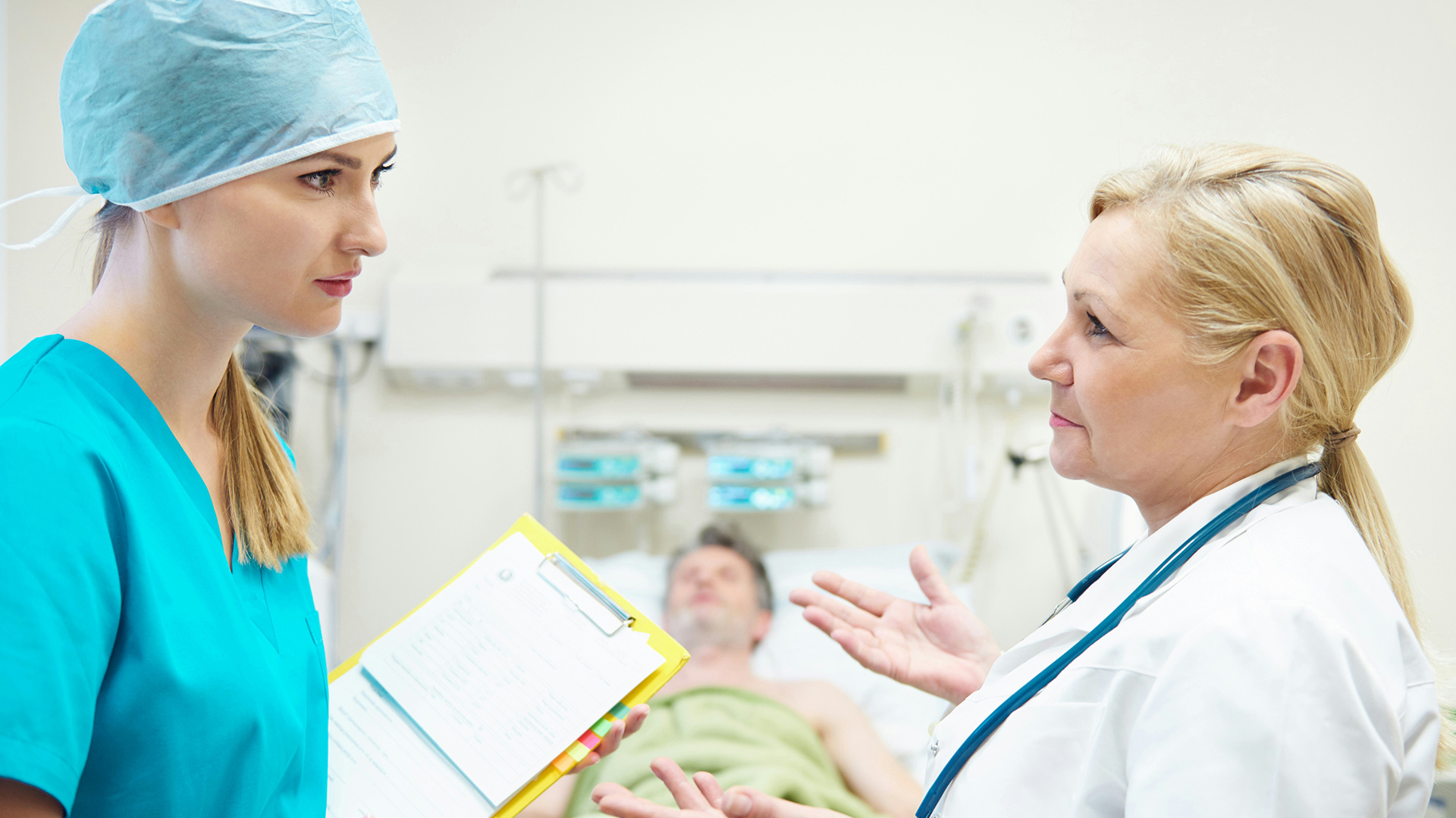 Pflegefachkräfte stehen im Austausch mit Ärztinnen und Ärzten, um die Entwicklung der Patientinnen und Patienten zu besprechen und zu dokumentieren. So ist der gesamte Behandlungsverlauf nachvollziehbar.